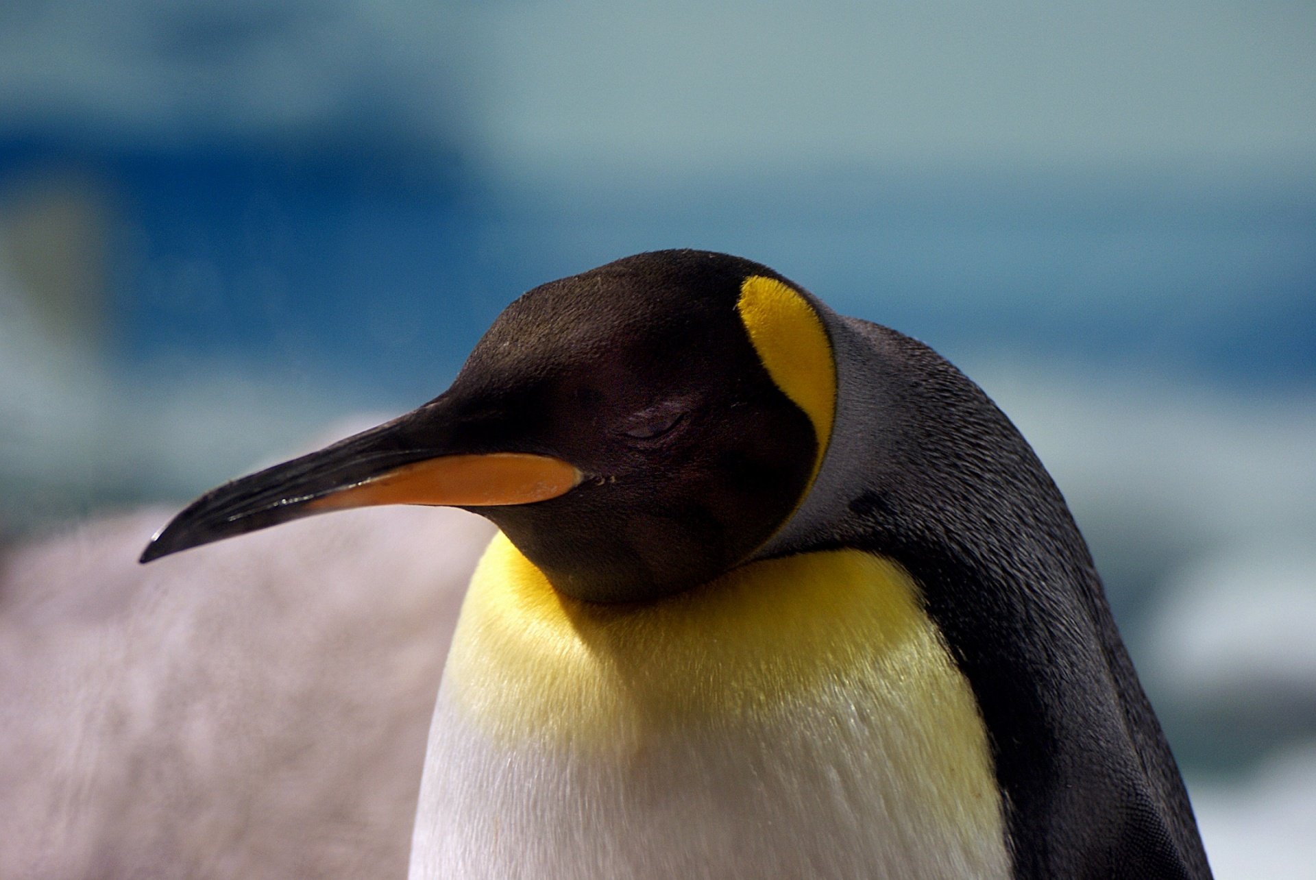 Unlike the emperor penguin (Aptenodytes forsteri), which breeds on Antarctic sea ice during winter, king penguins breed on vegetated or rocky subantarctic shores. This distinction means king penguins are not exposed to the extreme temperatures that characterize emperor penguin breeding grounds.